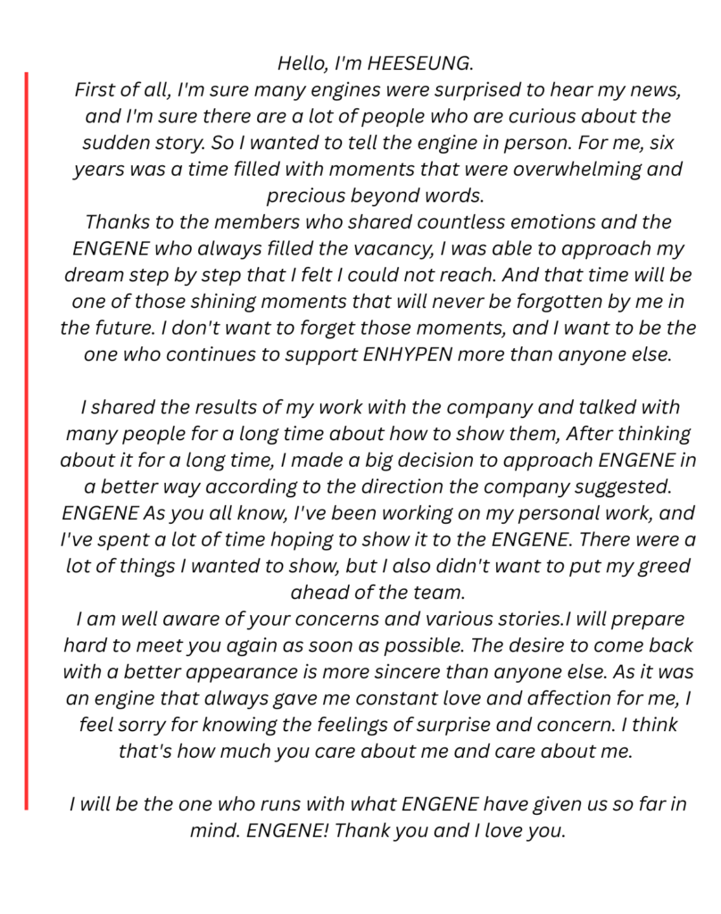 Heeseung didn’t stay quiet for long. He shared a personal handwritten letter on Weverse shortly after the news broke. In it, he looked back on six years with the members and ENGENEs, dating all the way back to I-LAND in 2020.